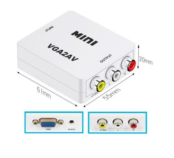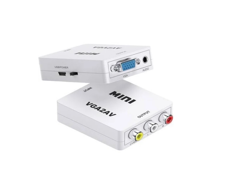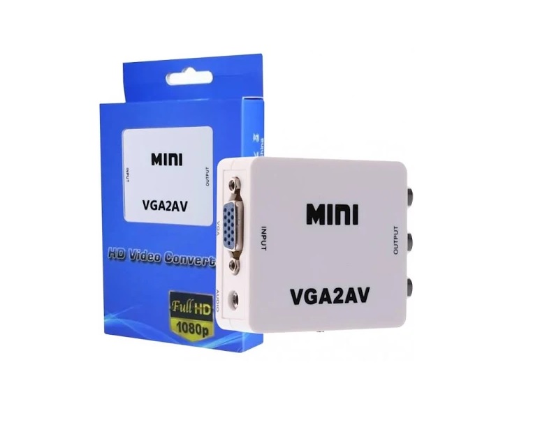 CONVERSOR VGA A RCA/ AV + AUDIO -Convierte las imágenes de PC entrantes a RCA NTSC o PAL. -Puerto de Entrada 1 x VGA -Puerto de Entrada 1 x Audio mini plug 3.5 -Puerto de Salida 1 x AV RCA -Fuente de Alimentación de USB -Dimensiones: 6.1 x 5.5 x 2.2 cm -Peso 44 gramos -Soporta entrada de PC de alta resolución de hasta SXGA (@ 60Hz). -Soporta resolución: 640×480 60 fps; 800×600 60 fps, 75 fps; 1024×768 60 fps, 75 fps 1280×720 60 fps; 1280×768 60 fps, 75 fps; 1280×1024 60 fps, 75 fps; 1360×768 60 fps; 1400×1050 60 fp -Alimentación: puerto mini USB