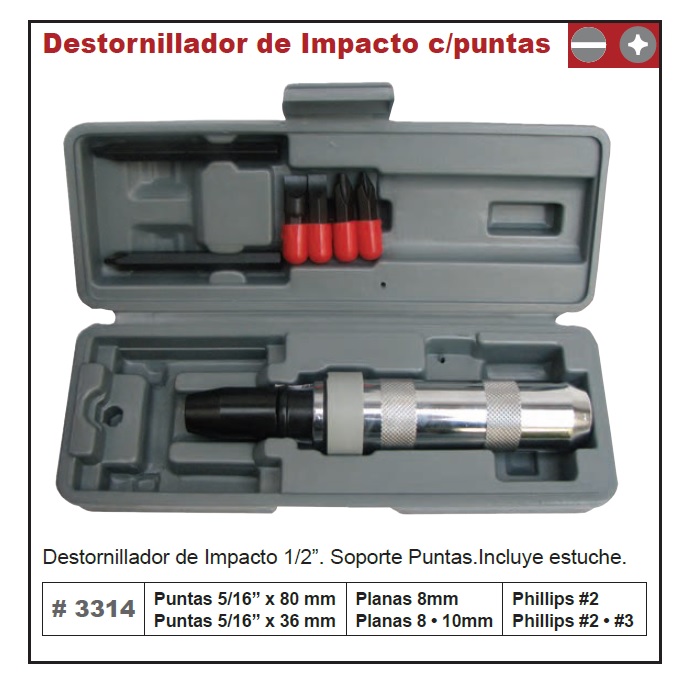 1 Punta 5/16″ x 80 Plana – 1 Punta 5/16″ x 80 Phillips – 1 Punta 8 mm x 35mm.