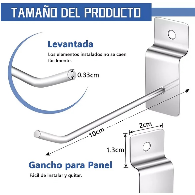 Ganchos para paneles de aproximadamente 10cm de largo y 0,33 cm/0,13 pulgadas de grosor, suficientes para su uso diario o sus necesidades de reemplazo.GANCHOS DE CALIDAD