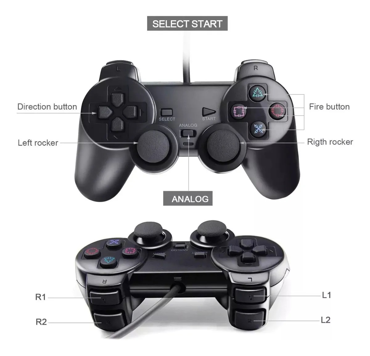 Joystick compatible playstation 2 con cable 100% Funcionales y compatibles. Excelente calidad Blister Para colgar. Color: Negro.
