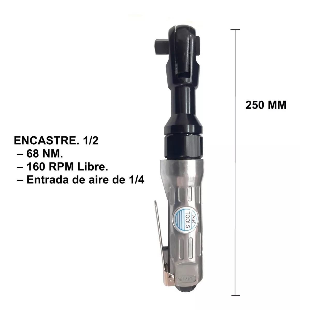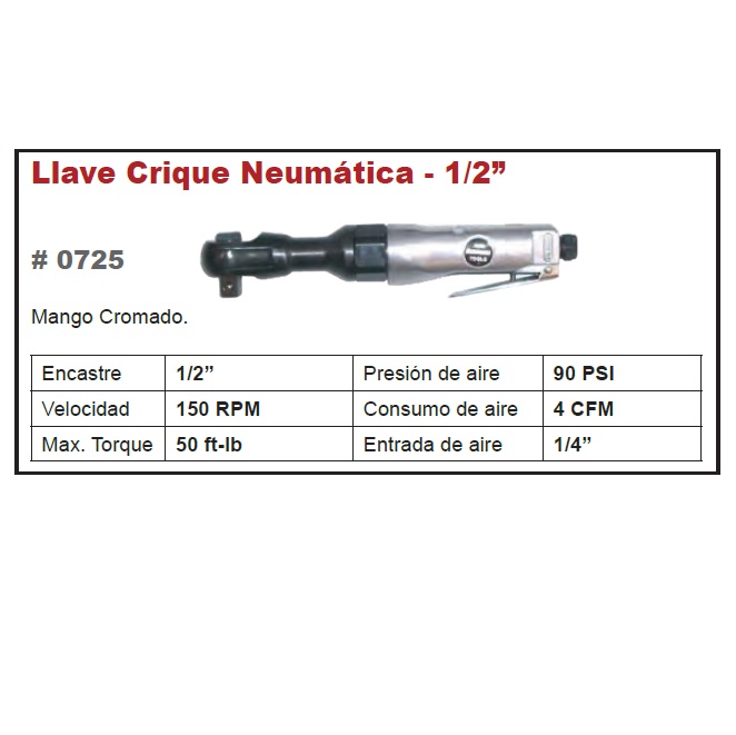 LLAVE CRIQUE NEUMÁTICA PROFESIONAL – ENCASTRE. 1/2 – 68 NM. – 160 RPM Libre. – Entrada de aire de 1/4 – Salida de escape delantera. – Giro izquierda/derecha.