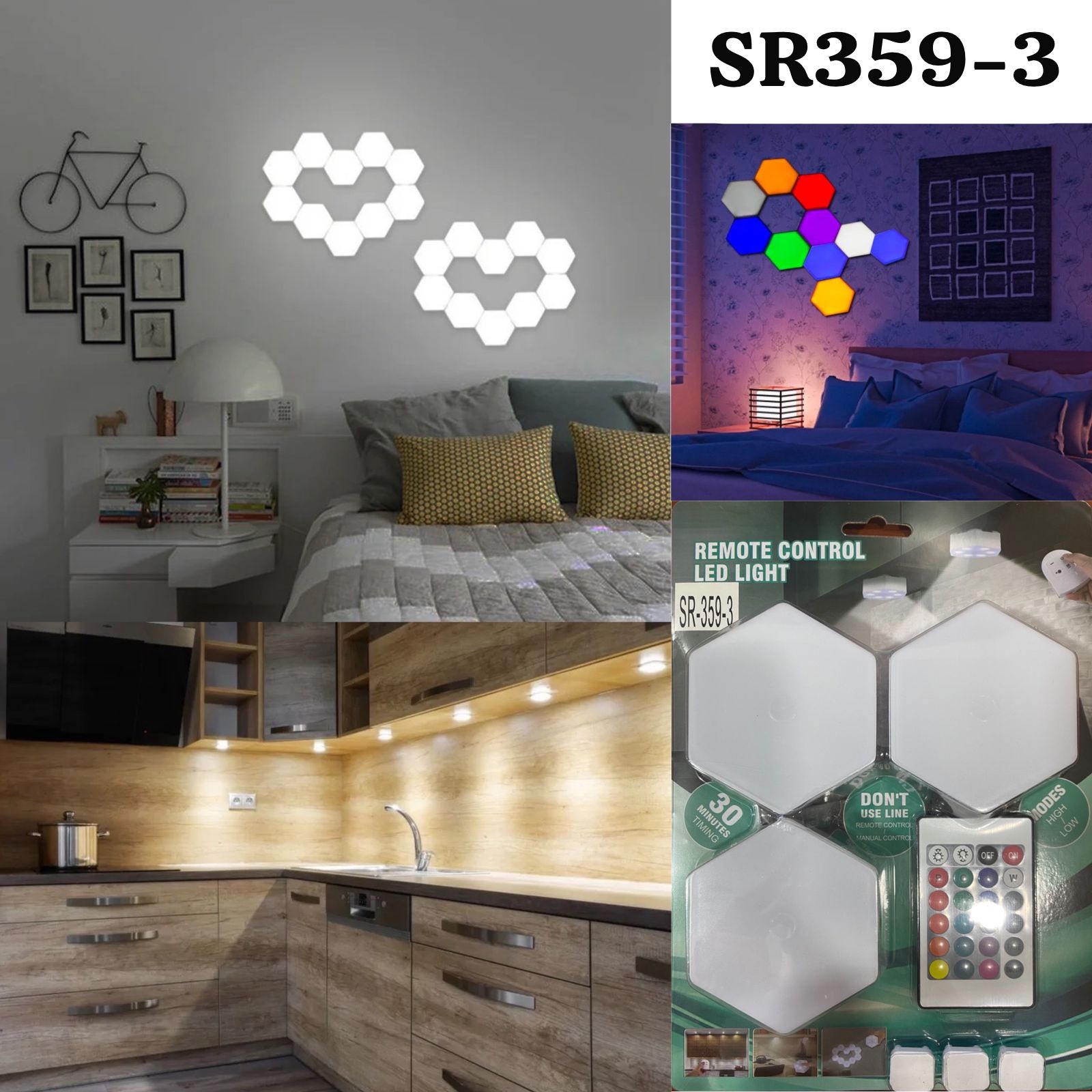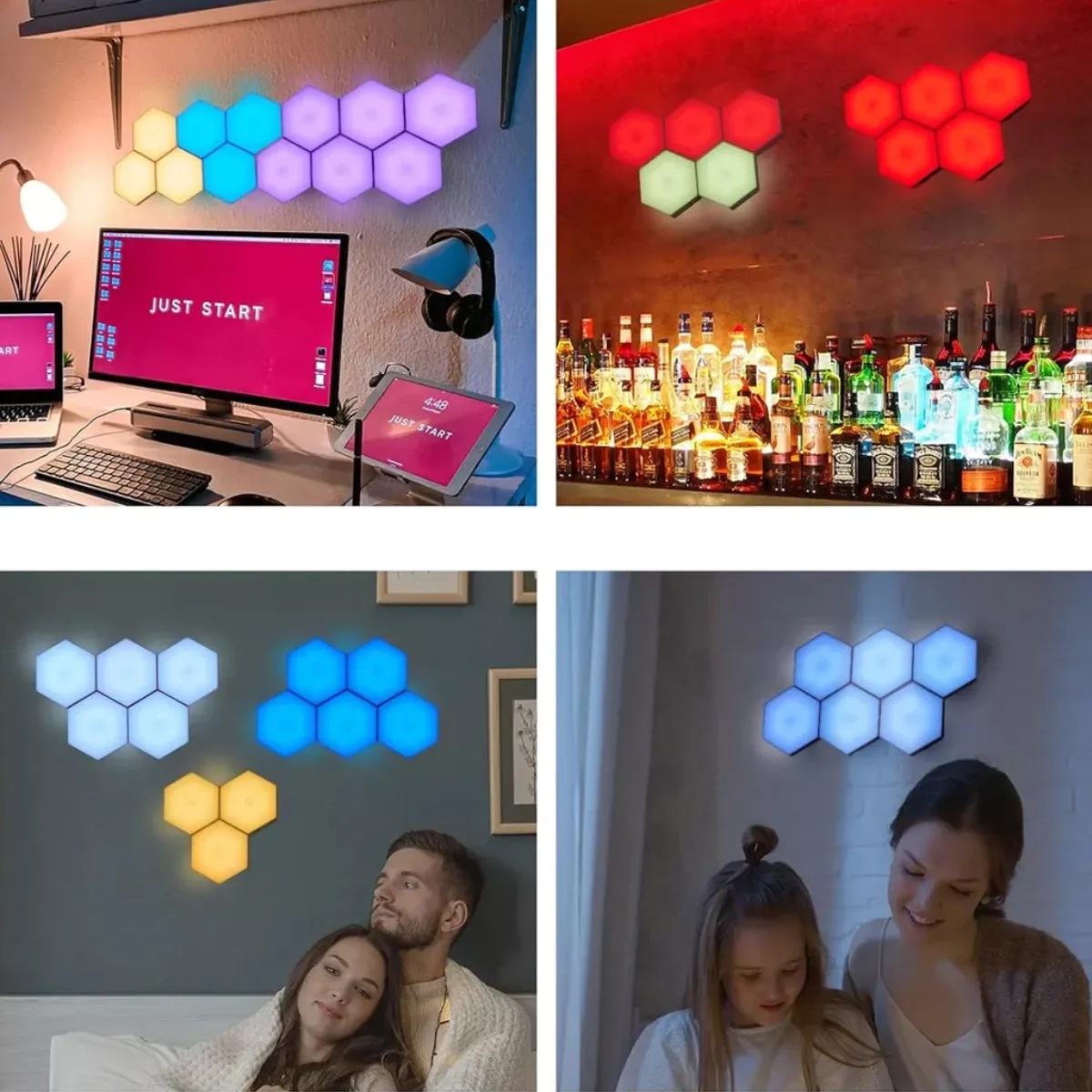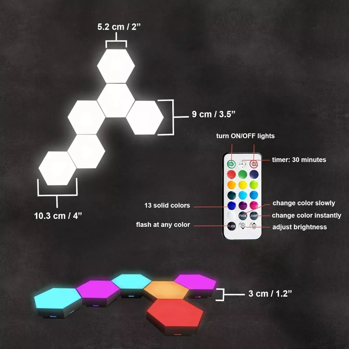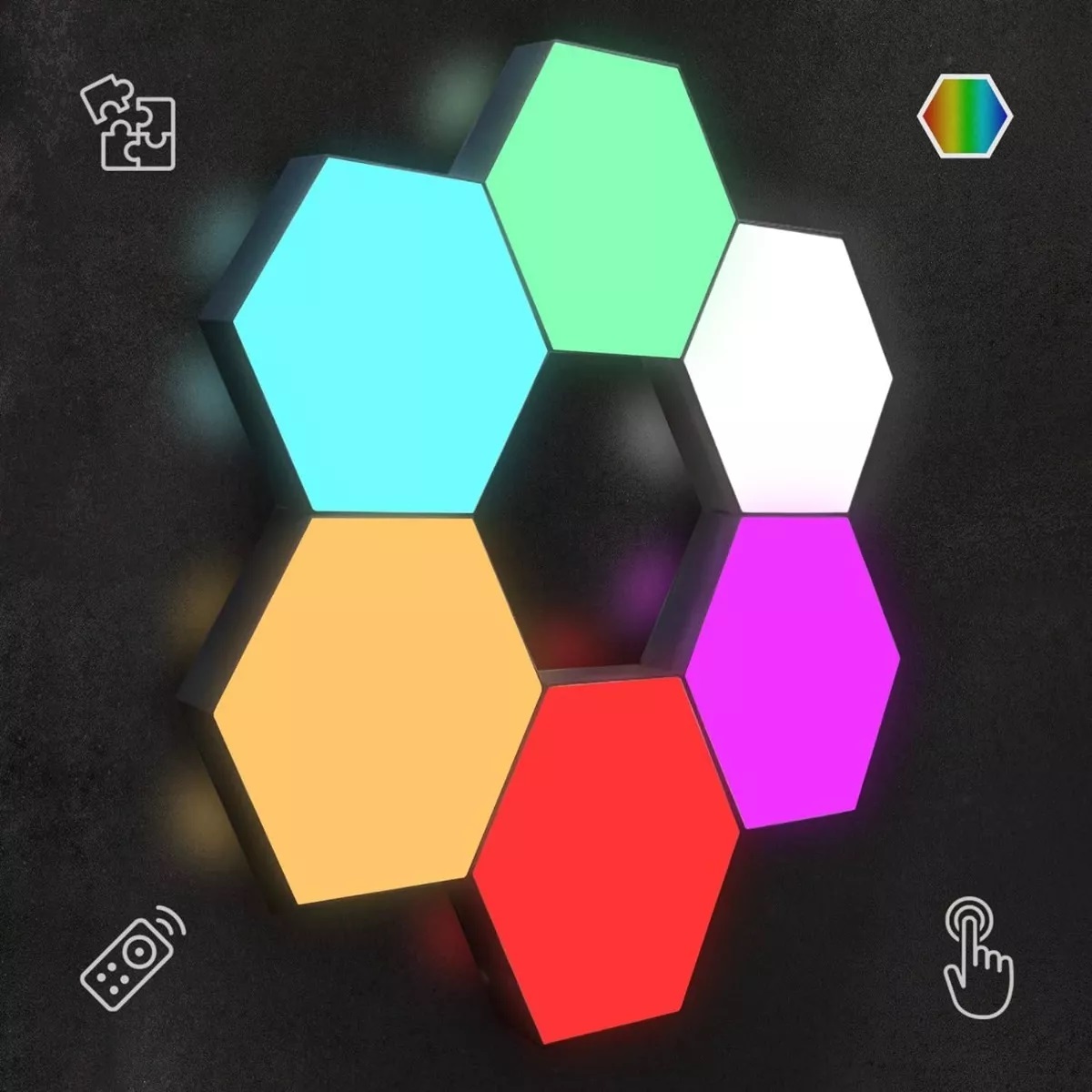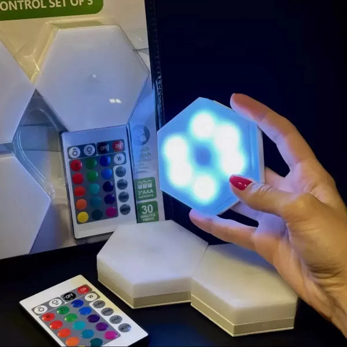 El Set de 3 luces hexagonales LED RGB COLORES con control te permite crear diseños únicos y minimalistas gracias a que puedes separar el diseño y ubicarlos como quieras. También podrás controlar la tonalidad de las luces con el control remoto encontrando tu color favorito (RGB).