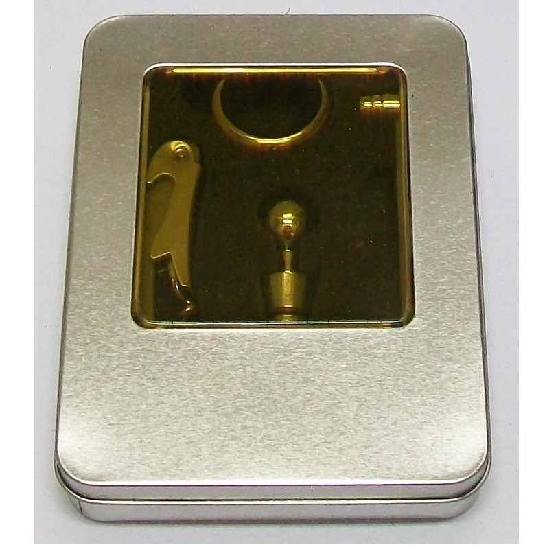 Set de vino 4 piezas Incluye: termómetro, aro corta gota, tapón y destapador.