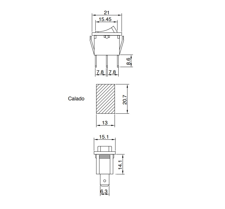 Tecla MINI Inversora c/Punto Medio On-Off-On 250v 3amp 3T 1polo 21.4x15mm Negra